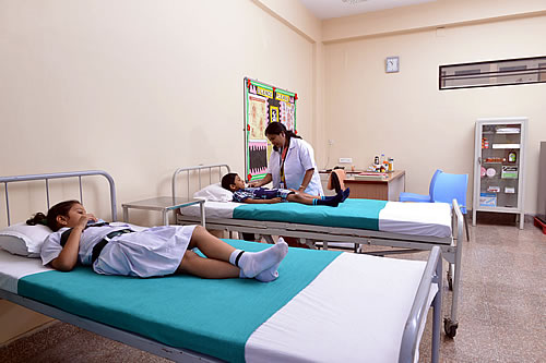 With an overwhelming number of students, it is quite common to have students who fall sick or get hurt while playing. The first aid room in the school has a nurse during school hours who takes care of such children. First aid is admitted to the students as and when necessary. It also has 2 bed and wheel chairs for use, if the need arise.
